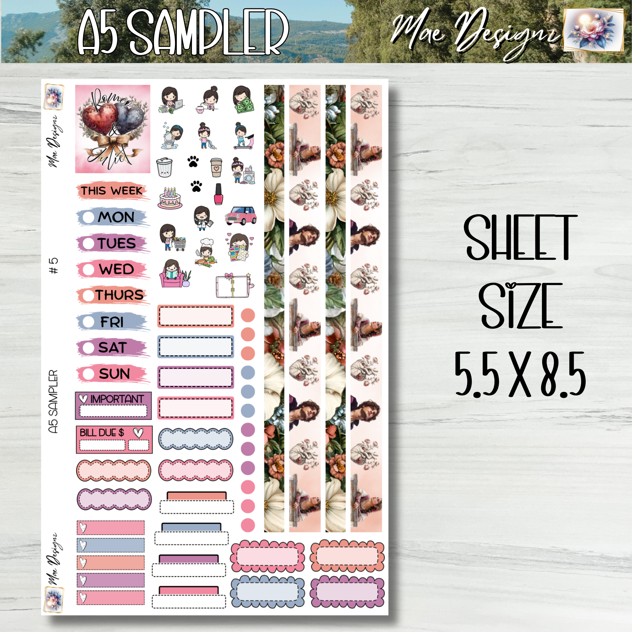 Sheet size is 5.5 x 8.5. This sticker sheet comes printed on removable matte paper and stickers work wonderfully for A5 size planners.