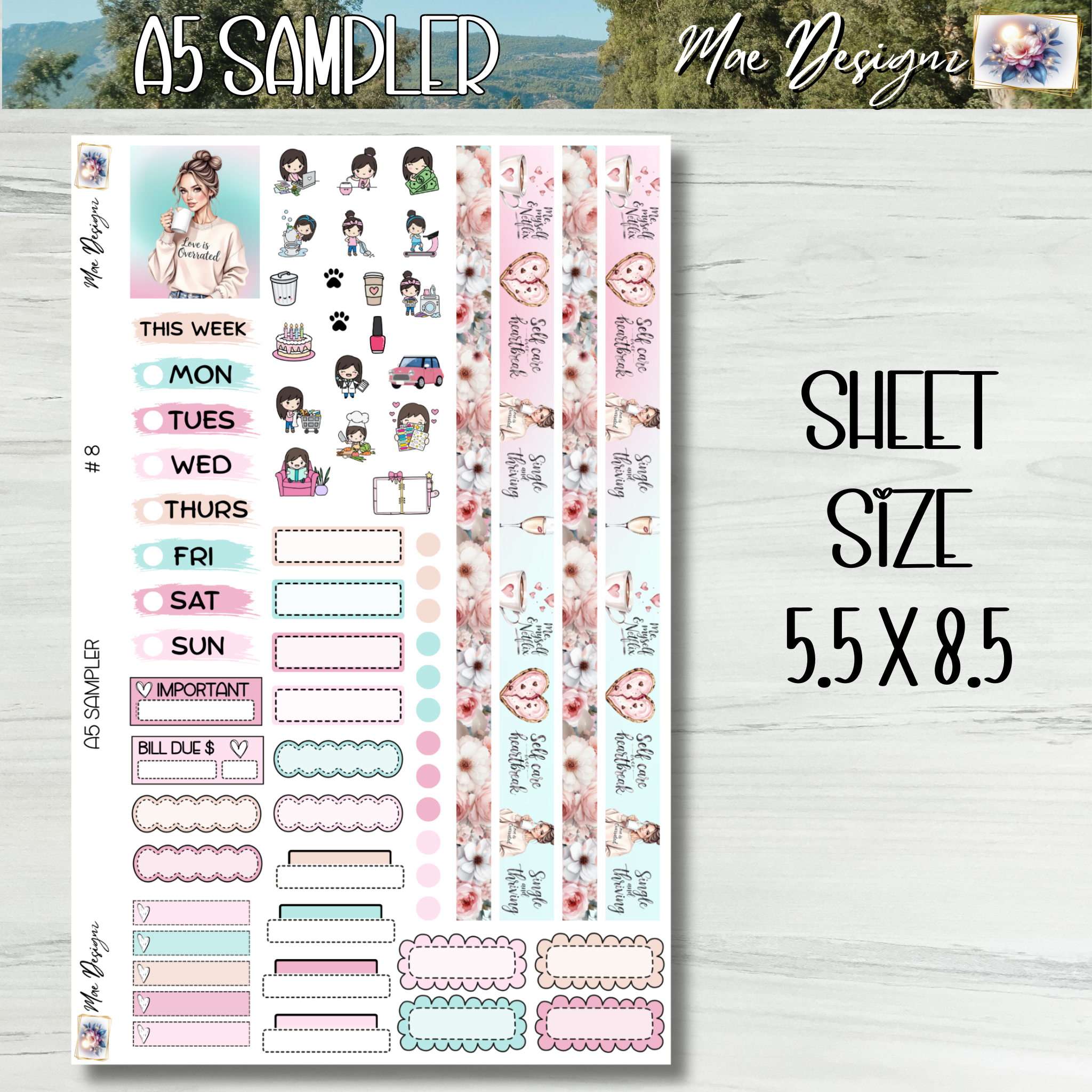 Sheet size is 5.5 x 8.5. This sticker sheet comes printed on removable matte paper and stickers work wonderfully for A5 size planners.