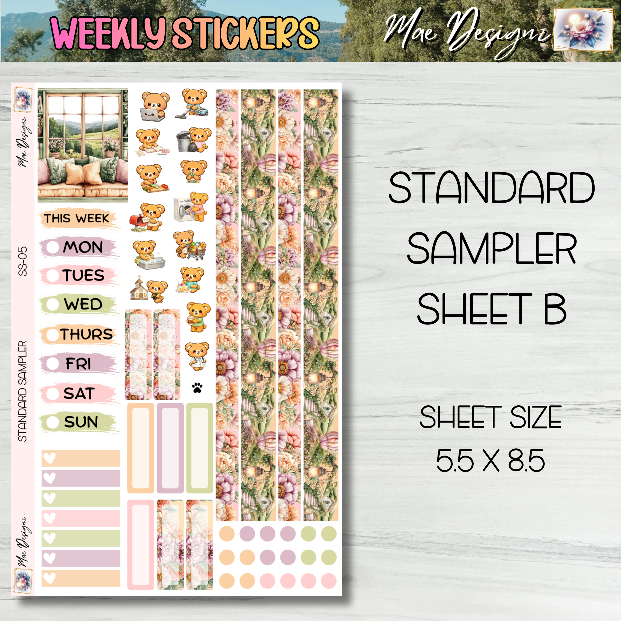 Sampler sheet sizes are 5.5 x 8.5 and the labels are 3.25 x 6.5. Two sizes to choose from. These sticker sheets come printed on removable matte paper and stickers work wonderfully for A5 or standard size planners.