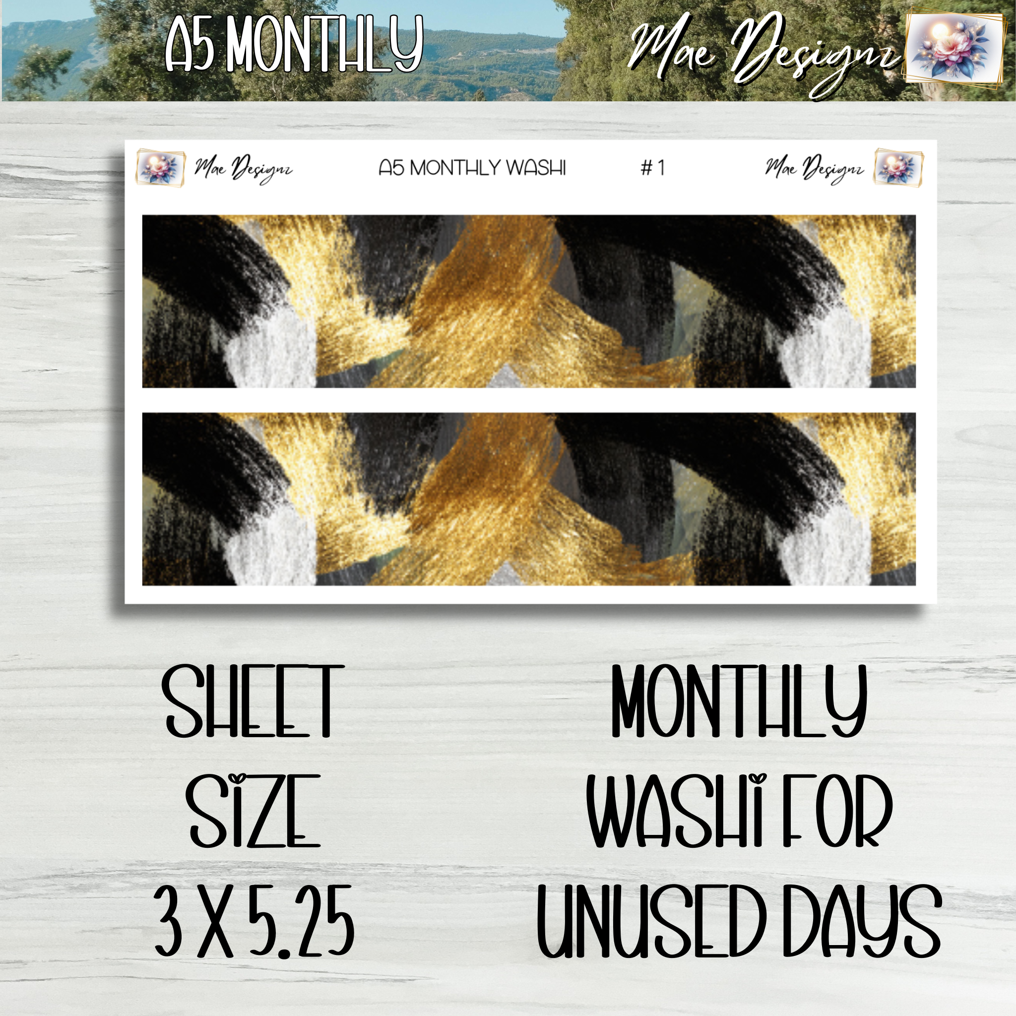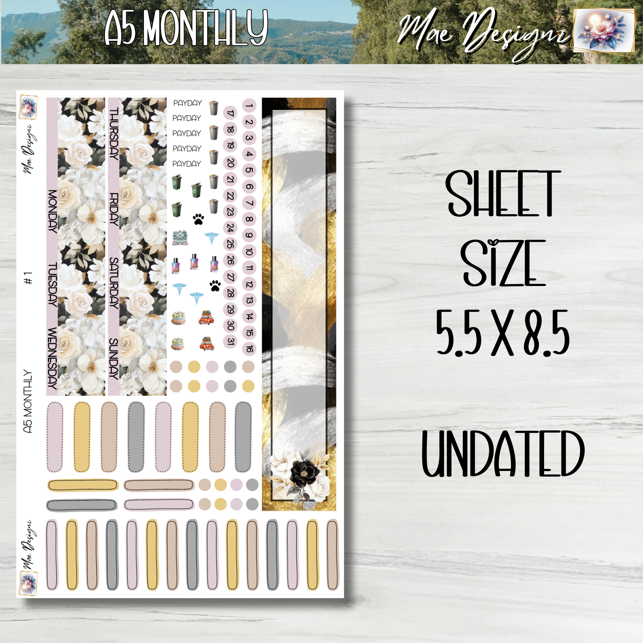 Sheet sizes are 5.5 x 8.5 and 3 x 5.25. Choose your option of dated or undated for the January monthly sheet. Includes the option of washi to cover the unused days in the monthly 2 page spread. All sheets are printed on removable matte sticker paper and work A5 planners. Some sticker surgery may be needed since I use A5 universal sizing.