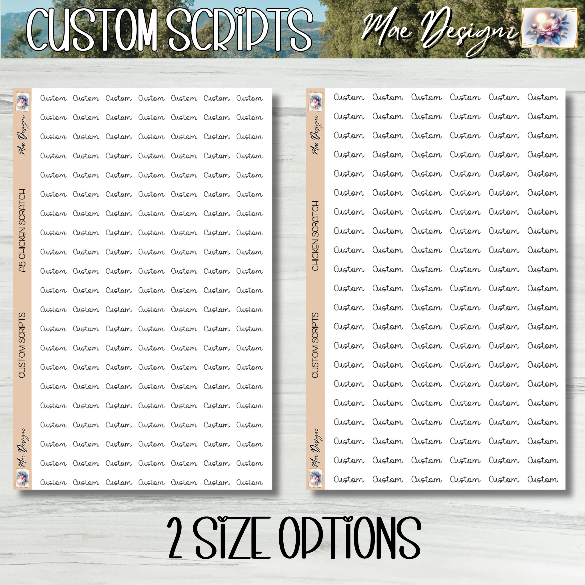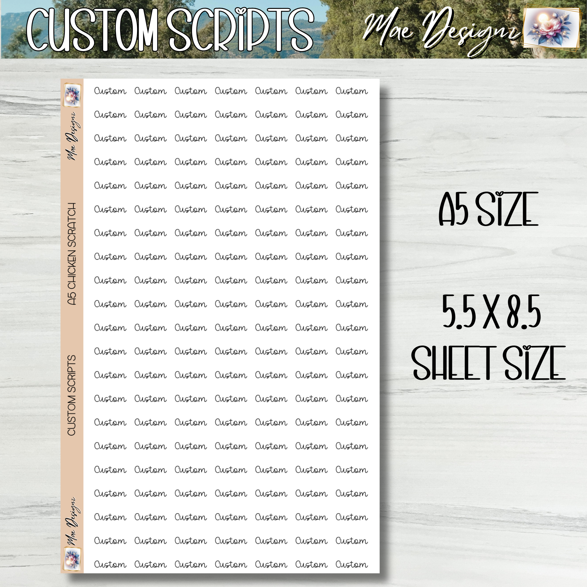 Sheet size is 5.5 x 8.5 with 21 rows of custom scripts. Stickers per row depend on length of chosen script. Please type in personalization and size choice from the dropdown menus below.