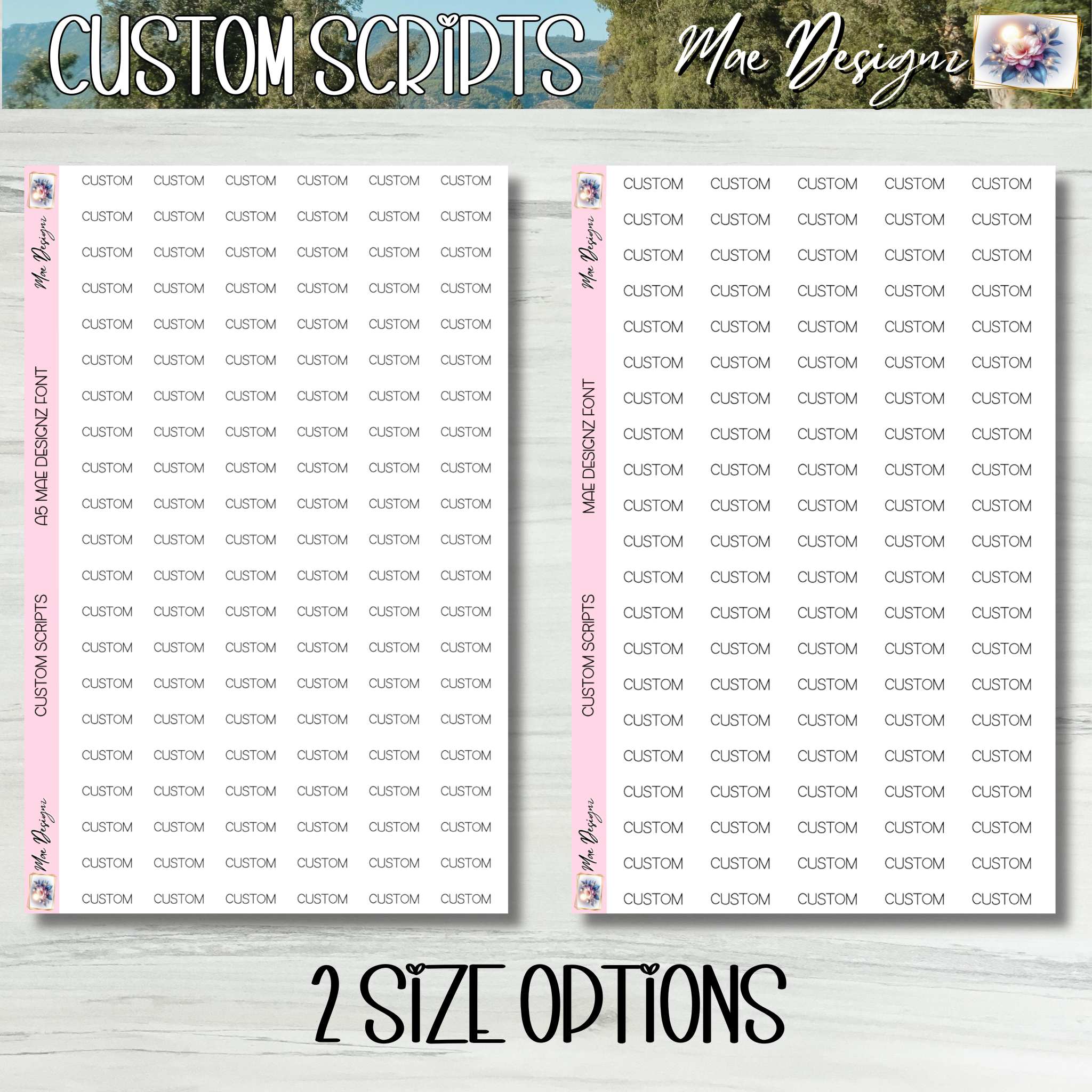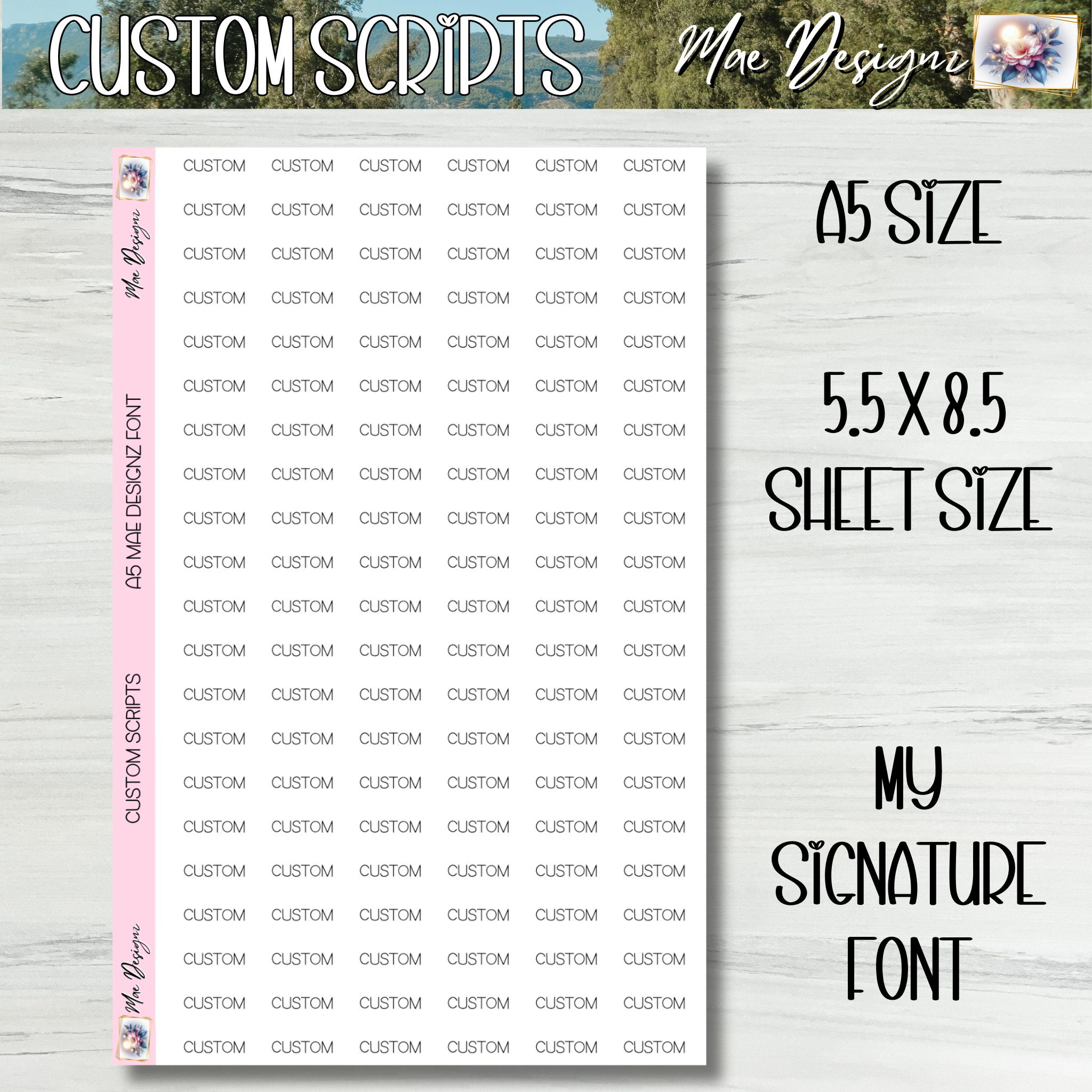 This is my signature font used in all collection sticker sheets. Sheet size is 5.5 x 8.5 with 21 rows of custom scripts. Stickers per row depend on length of chosen script. Please type in personalization and size choice from the dropdown menus below.