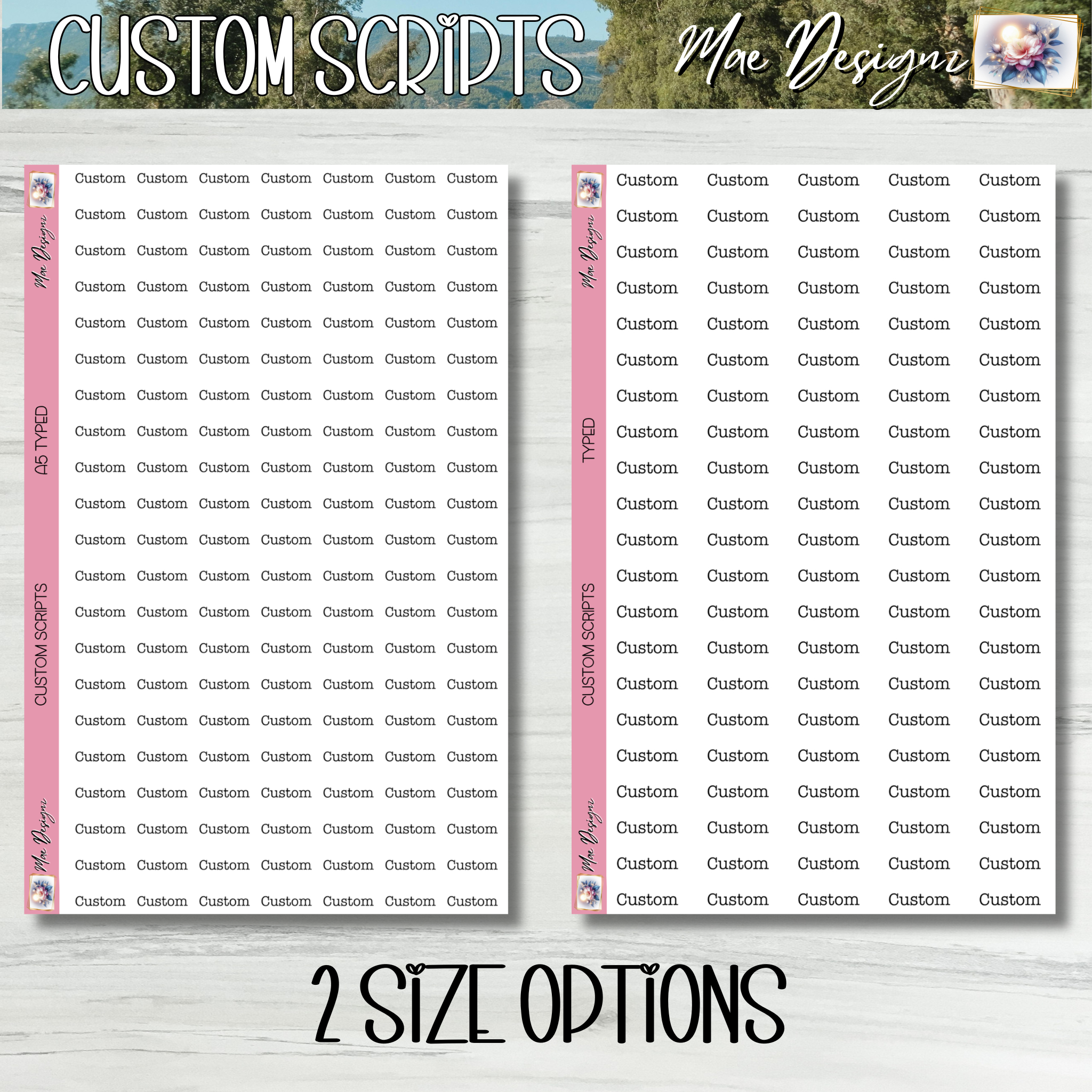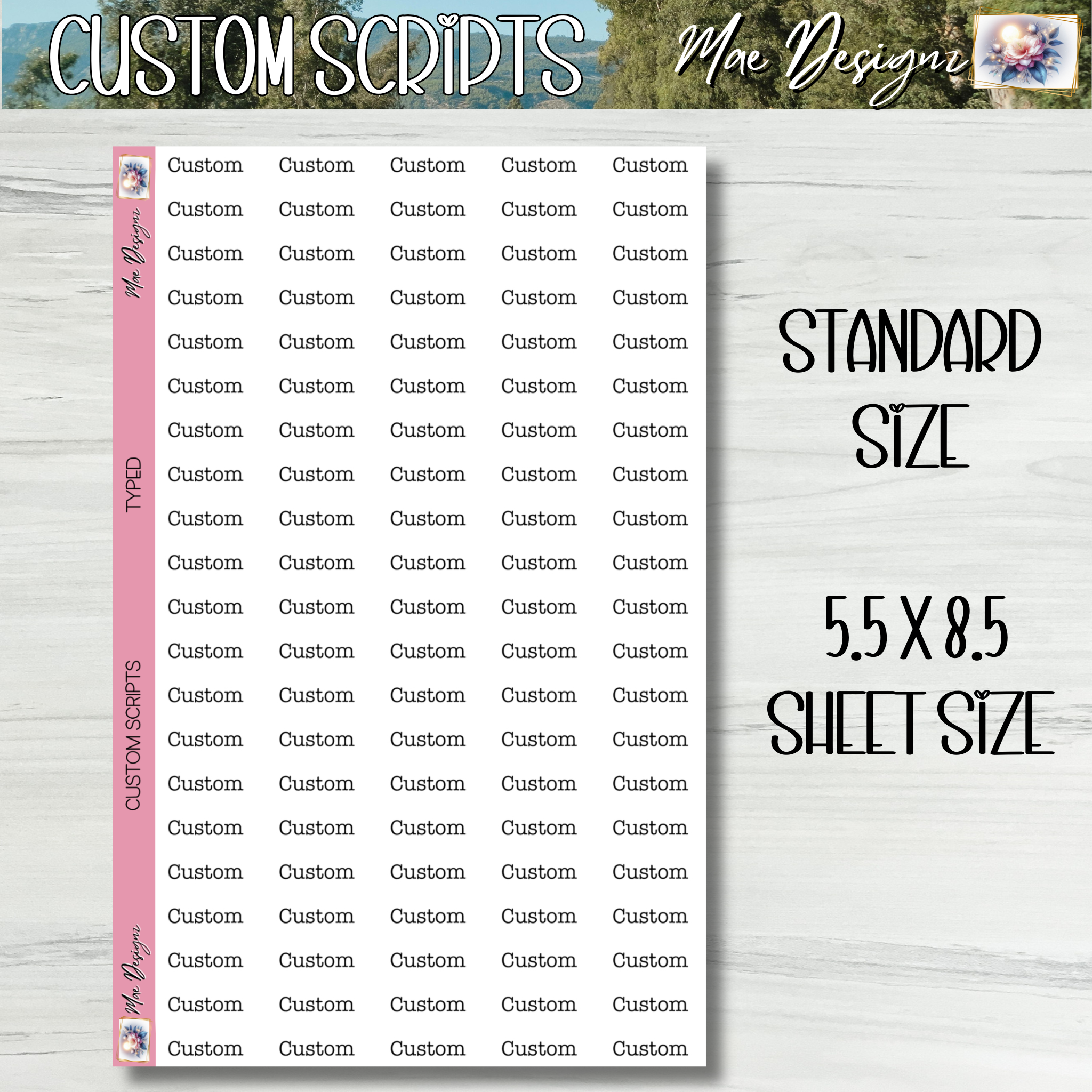 Sheet size is 5.5 x 8.5 with 21 rows of custom scripts. Stickers per row depend on length of chosen script. Please type in personalization and size choice from the dropdown menus below.